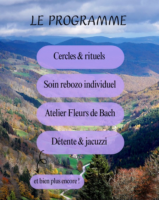 🌱 Au programme : soin individuel de bercements et resserrages par le tissu rebozo avec Lucie, atelier Fleurs de Bach personnalisé avec Manon, rituels & créations pour s’honorer, atelier d’auto soin, temps guidé en nature, spa…